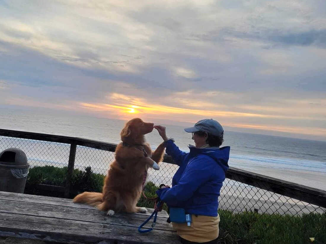 Lori Katz, pictured here with her support dog, started the ketogenic diet under Dr. Sethi’s supervision. She quickly noticed a difference. “It wasn’t just the depressive symptoms, but it was the feeling of lack of control,” she says. The diet “was like a tailwind — just blowing me into a better future.” Lori Katz hide caption