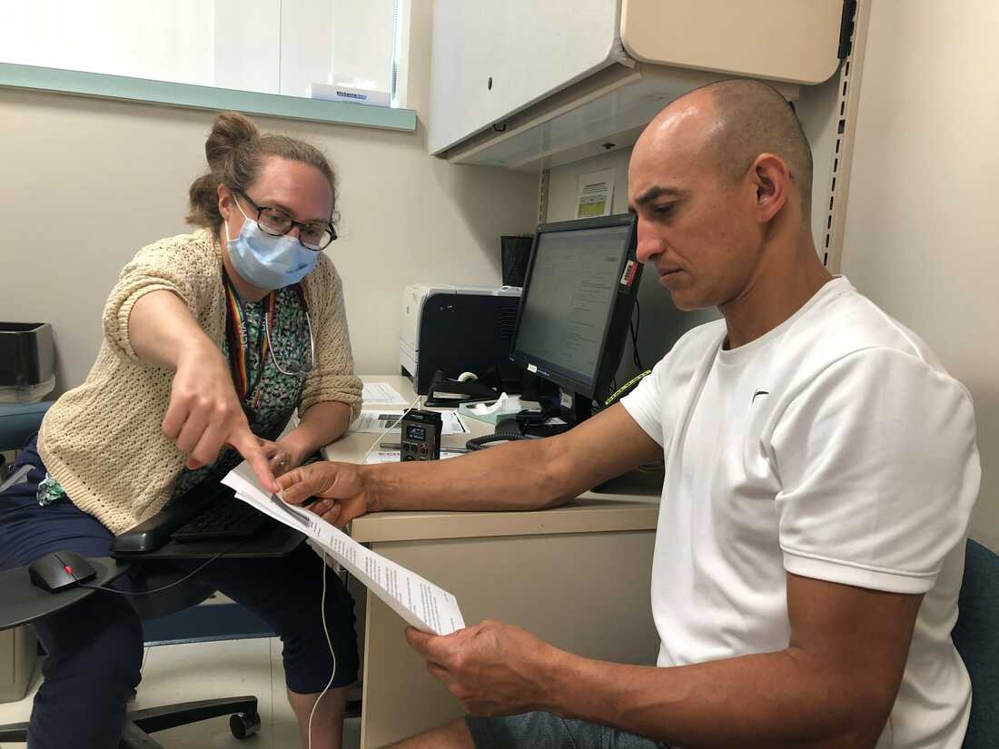 Dr. Rebecca Rogers practices primary care at the Cambridge Health Alliance in Somerville, Mass. During a recent appointment, she went over hydration tips with her patient Luciano Gomes, who works in construction. Martha Bebinger/WBUR hide caption