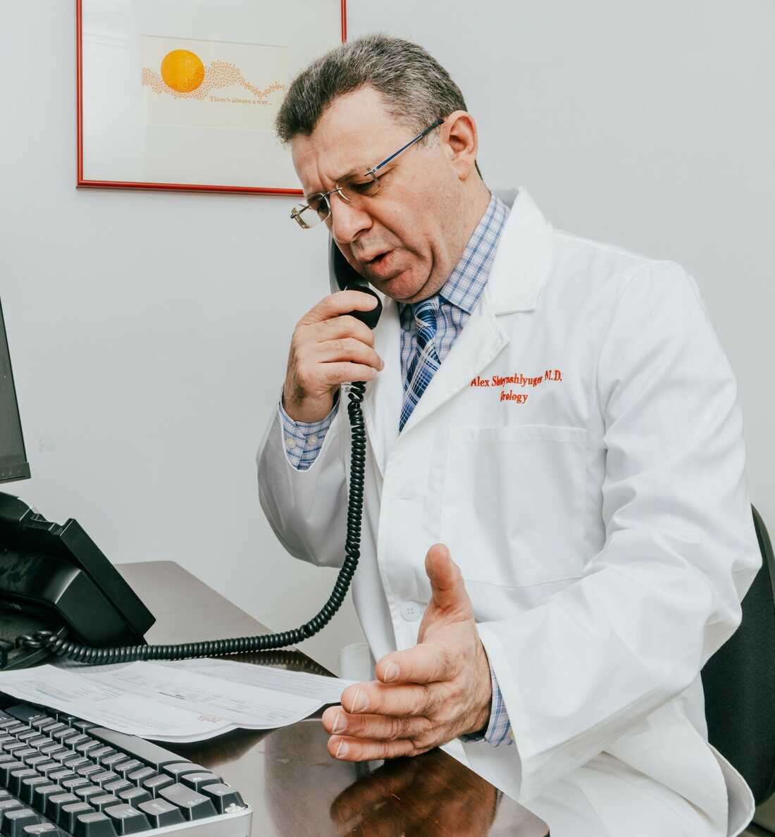Dr. Alex Shteynshlyuger spends hours on the phone with payment processors like Zelis, fighting their attempts to impose fees on electronic payments. DeSean McClinton-Holland/Pro Publica hide caption