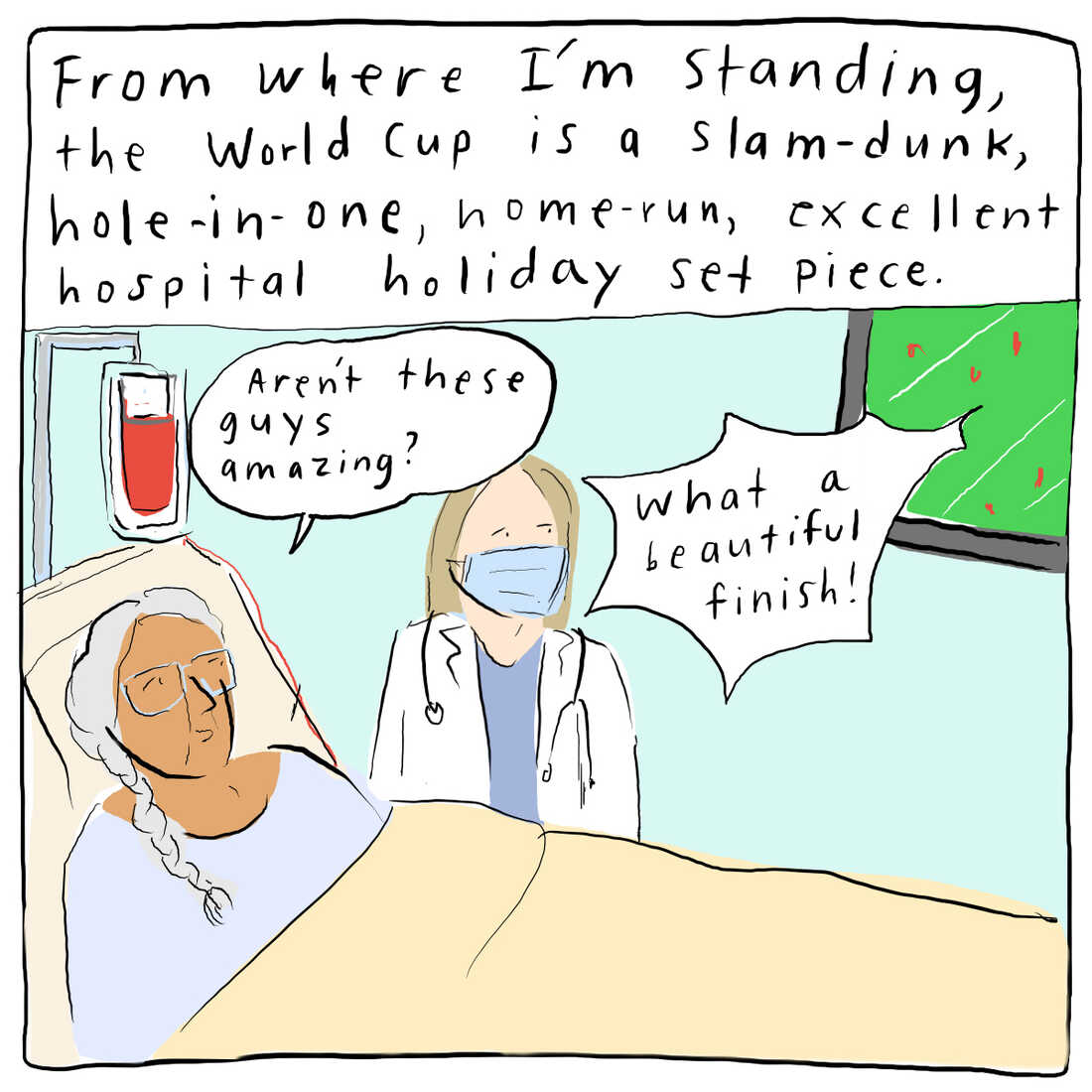 Hospitals can be lonely places as the days grow cold and long — especially during the holidays, and especially during a third pandemic winter. But this year cartoonist and physician Grace Farris, who works as a hospitalist in Austin, Texas was surprised and delighted to find her patients and colleagues rallying around a new sort of holiday spirit and connection — sparked by this month’s World Cup soccer play-offs.